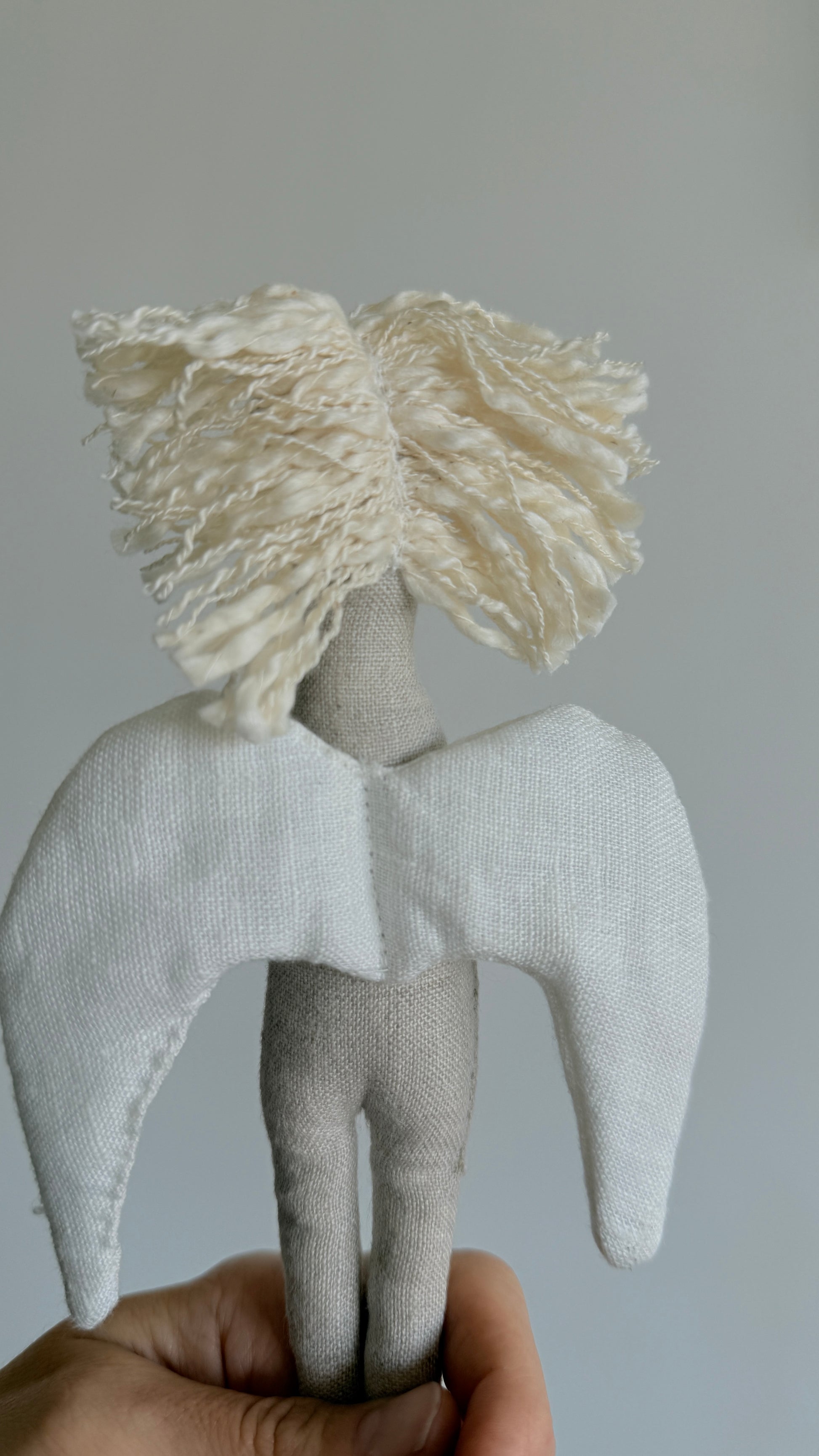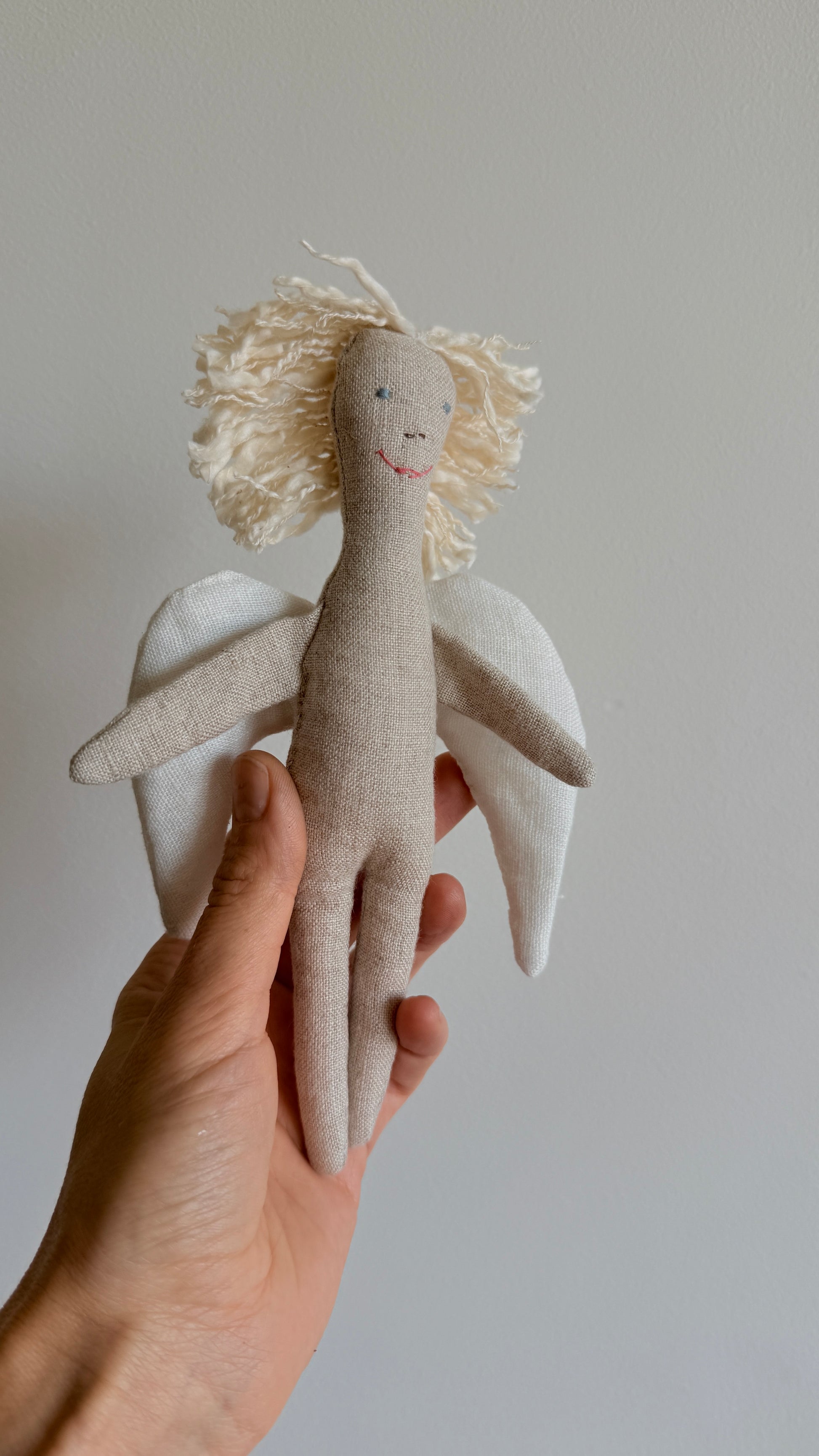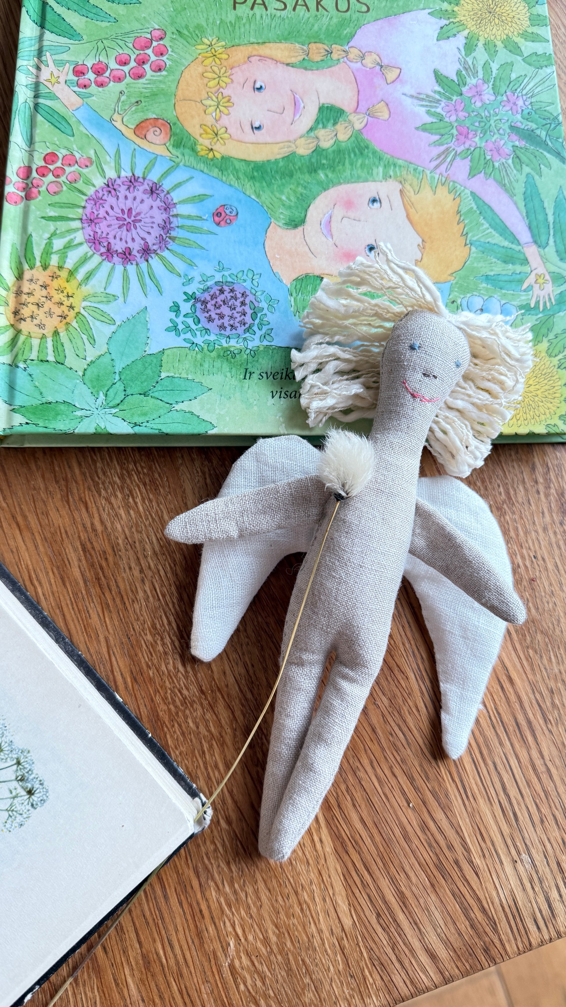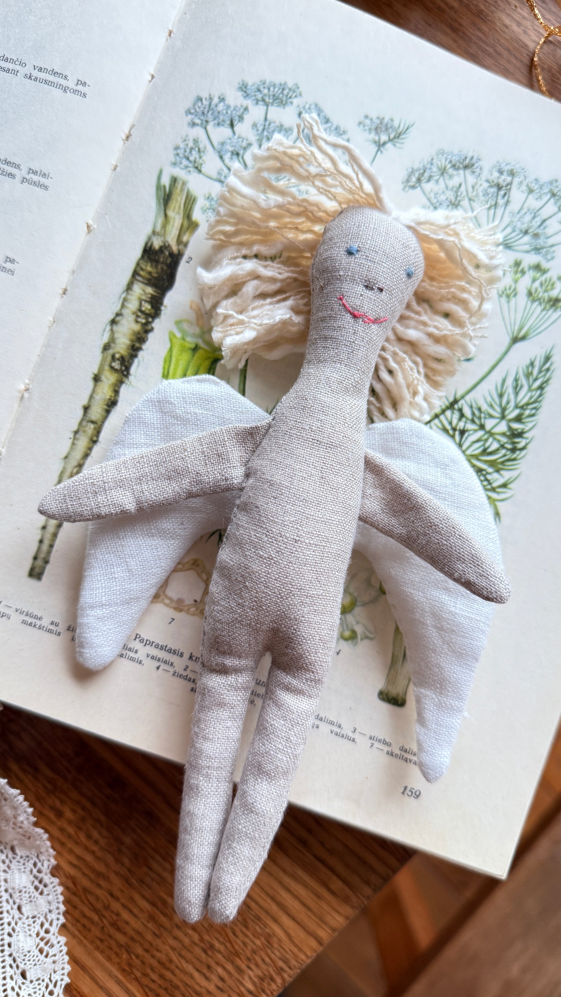 Medžiagos: pasiūtas iš sertifikuoto 100% natūralaus lino. Sparnai 100% balintas linas. Užpildas - antialerginis kamšalas žaislams. Medvilniniai siuvinėjimo siūlai. Plaukai - akrilas/vilna.