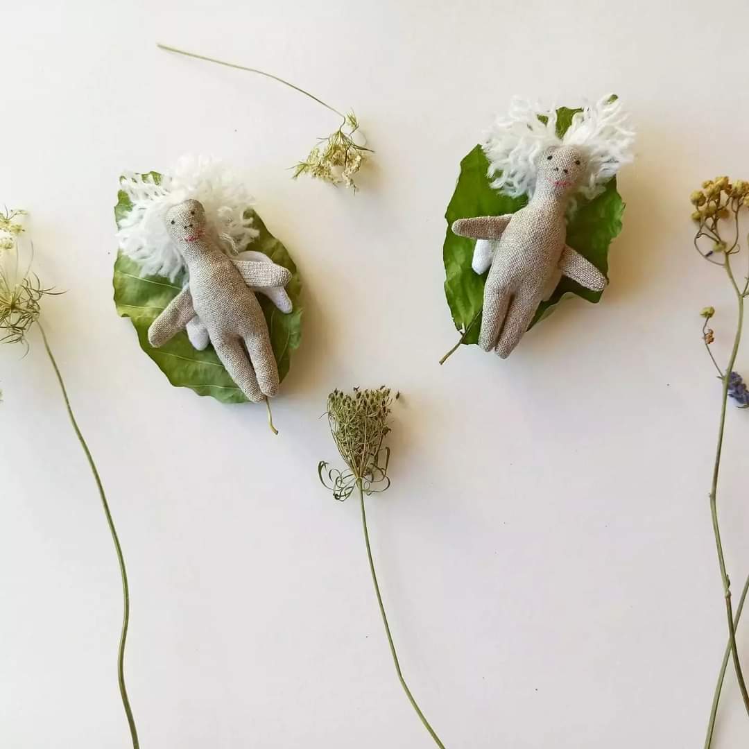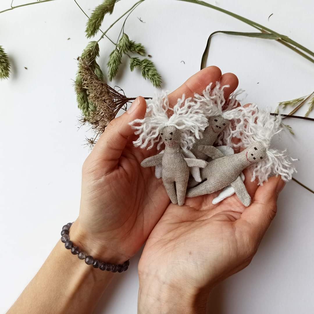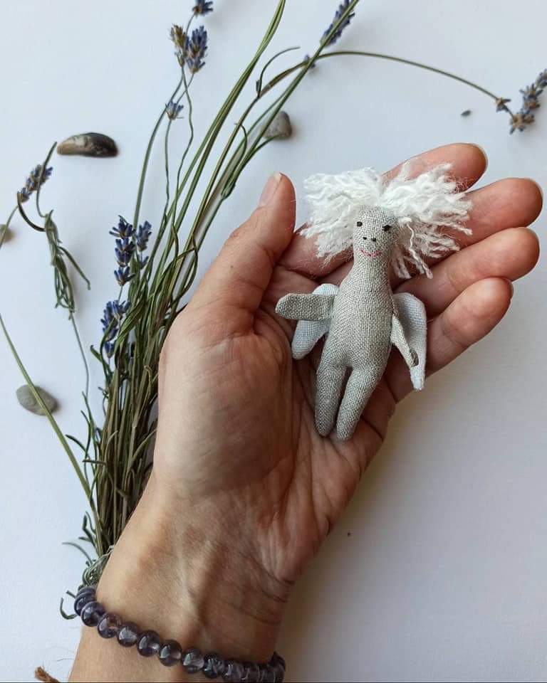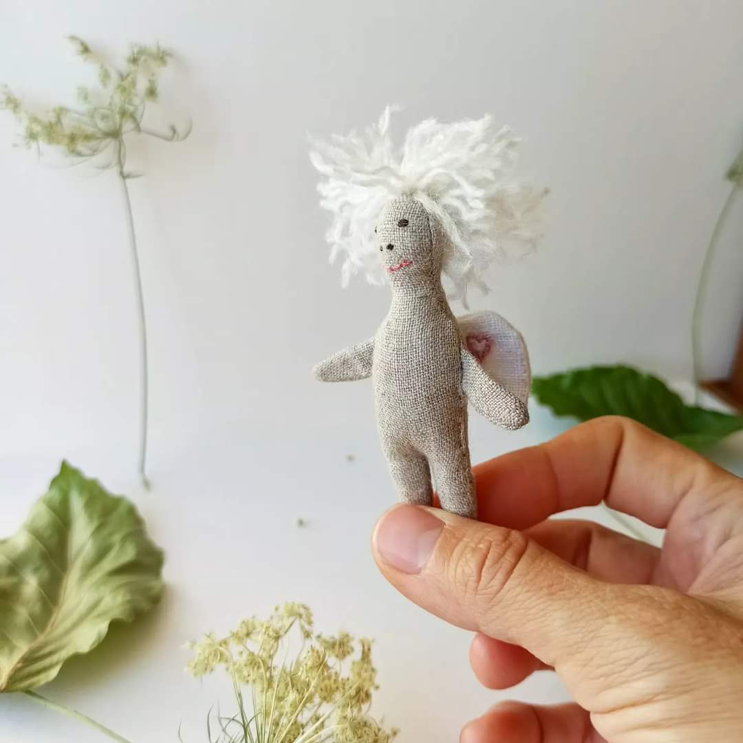 Medžiagos: pasiūtas iš sertifikuoto 100% natūralaus lino. Sparnai 100% balintas linas. Užpildas - antialerginis kamšalas žaislams. Medvilniniai siuvinėjimo siūlai. Plaukai - akrilas/vilna.
