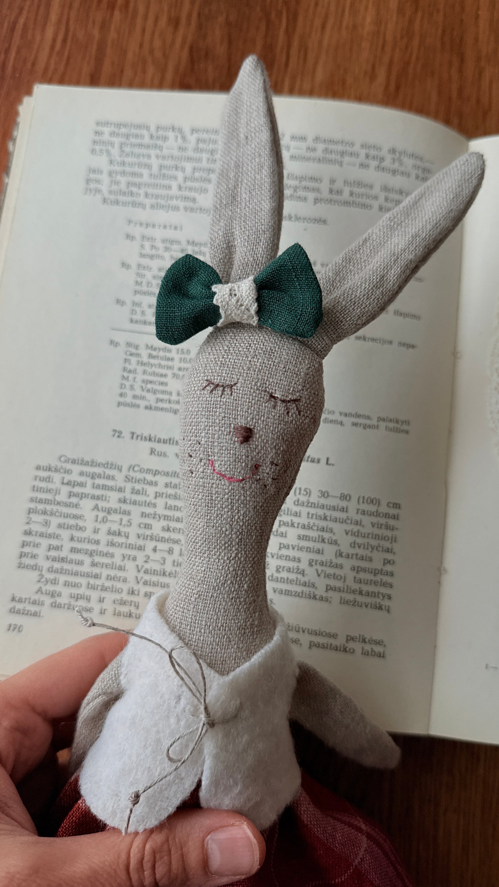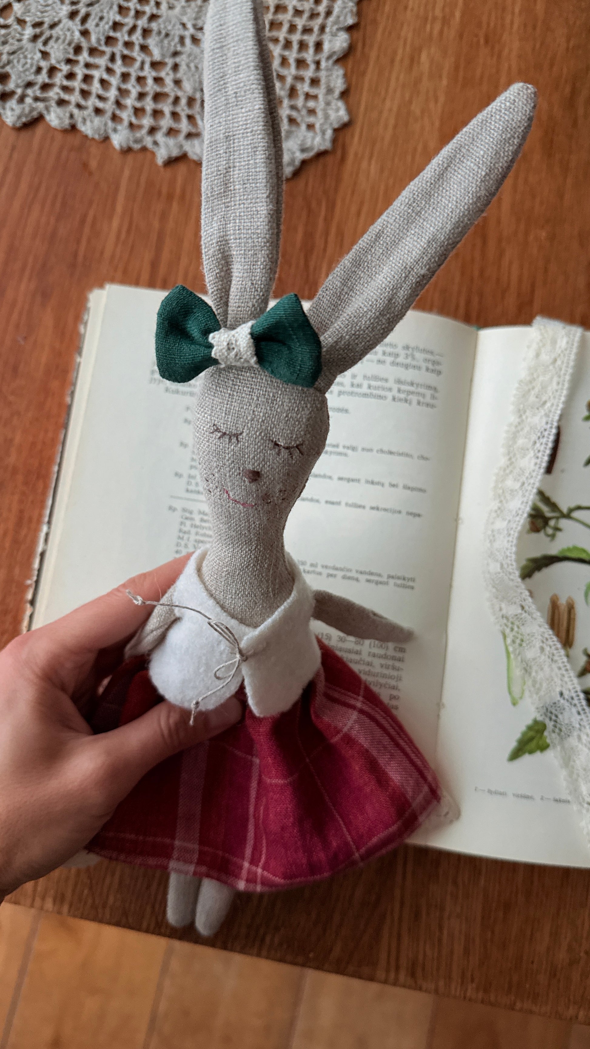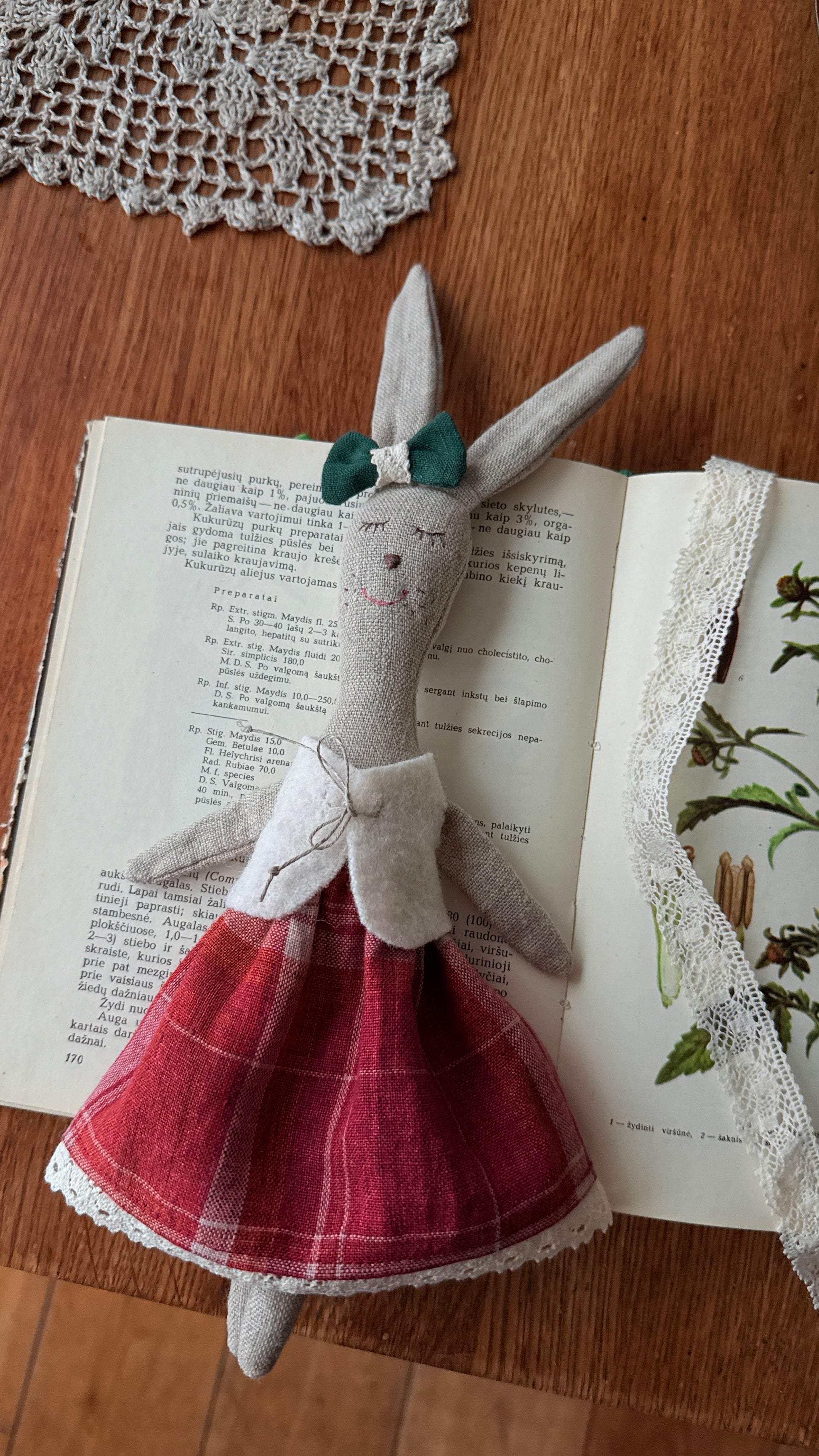 Medžiagos: kiškutė pasiūta iš sertifikuoto 100% natūralaus lino. Sijonėlis - 100% dažytas linas. Liemenė-100% vilna. Užpildas - antialerginis kamšalas žaislams. Medvilniniai siuvinėjimo siūlai. Poliesteriniai siuvimo siūlai. Lininė virvelė.