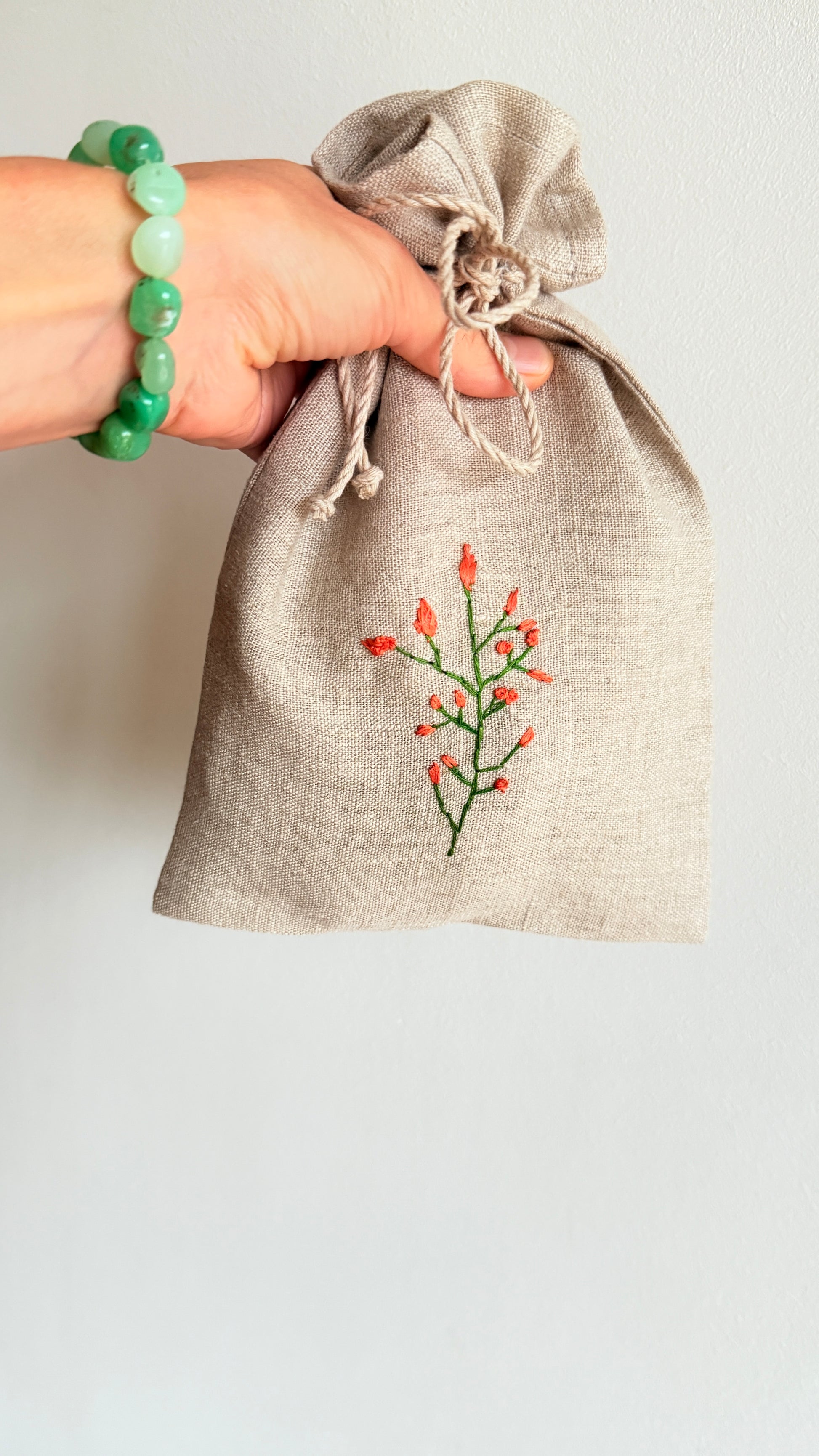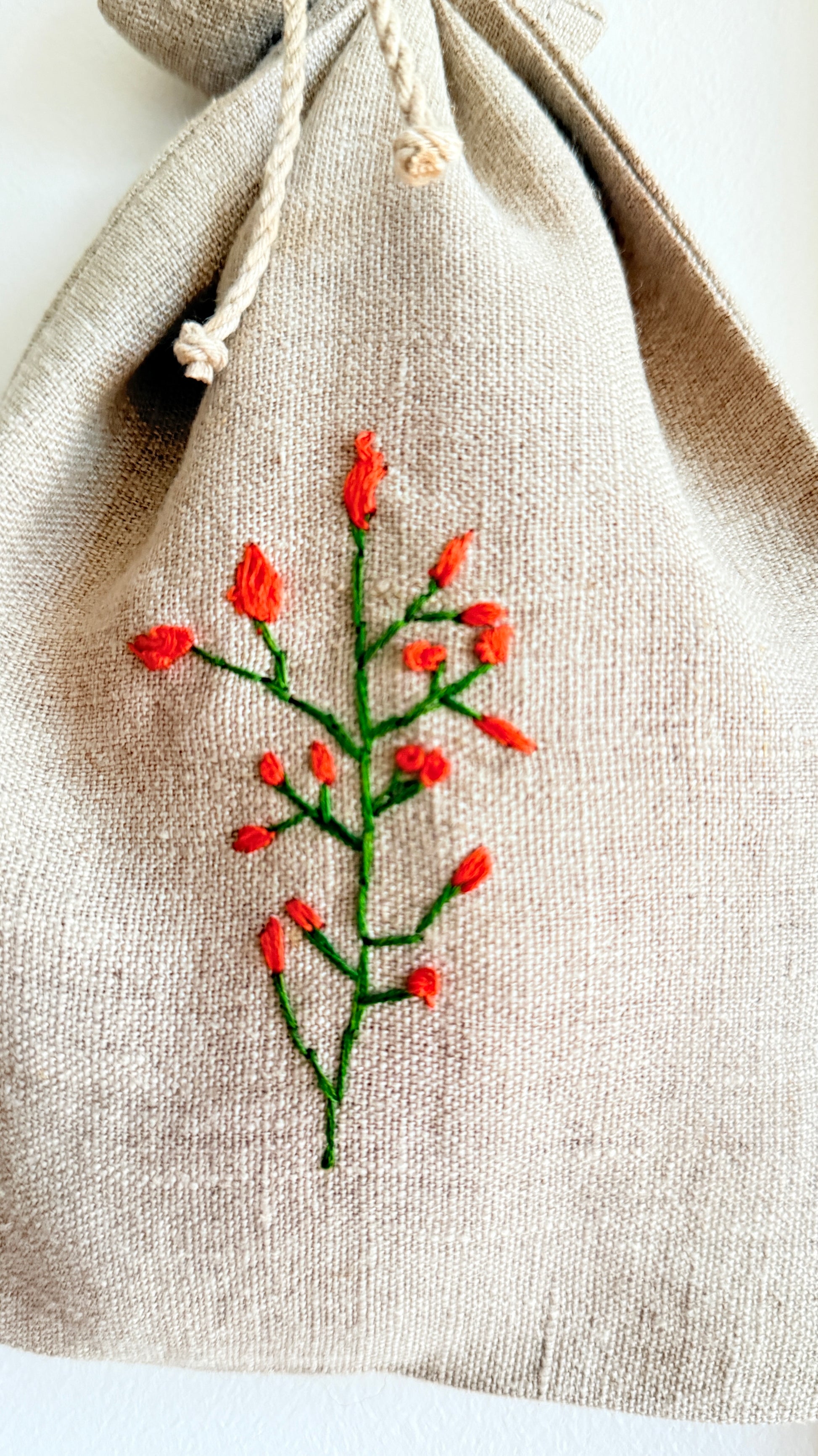 Medžiagos: 100% sertifikuotas aukštos kokybės linas, lininė virvelė, siuvimo poliesteriniai siūlai, siuvinėta medvilniniais siūlais