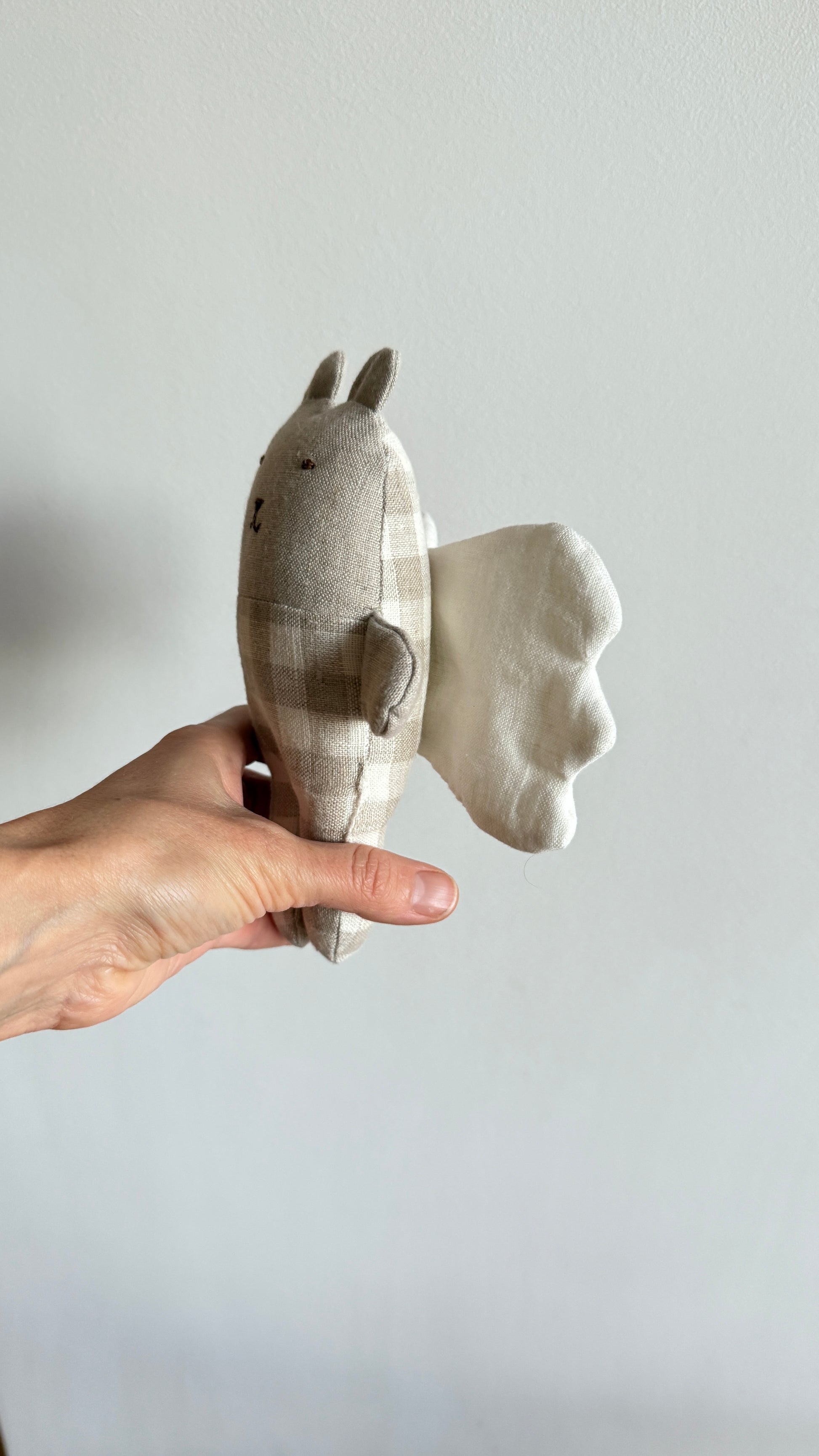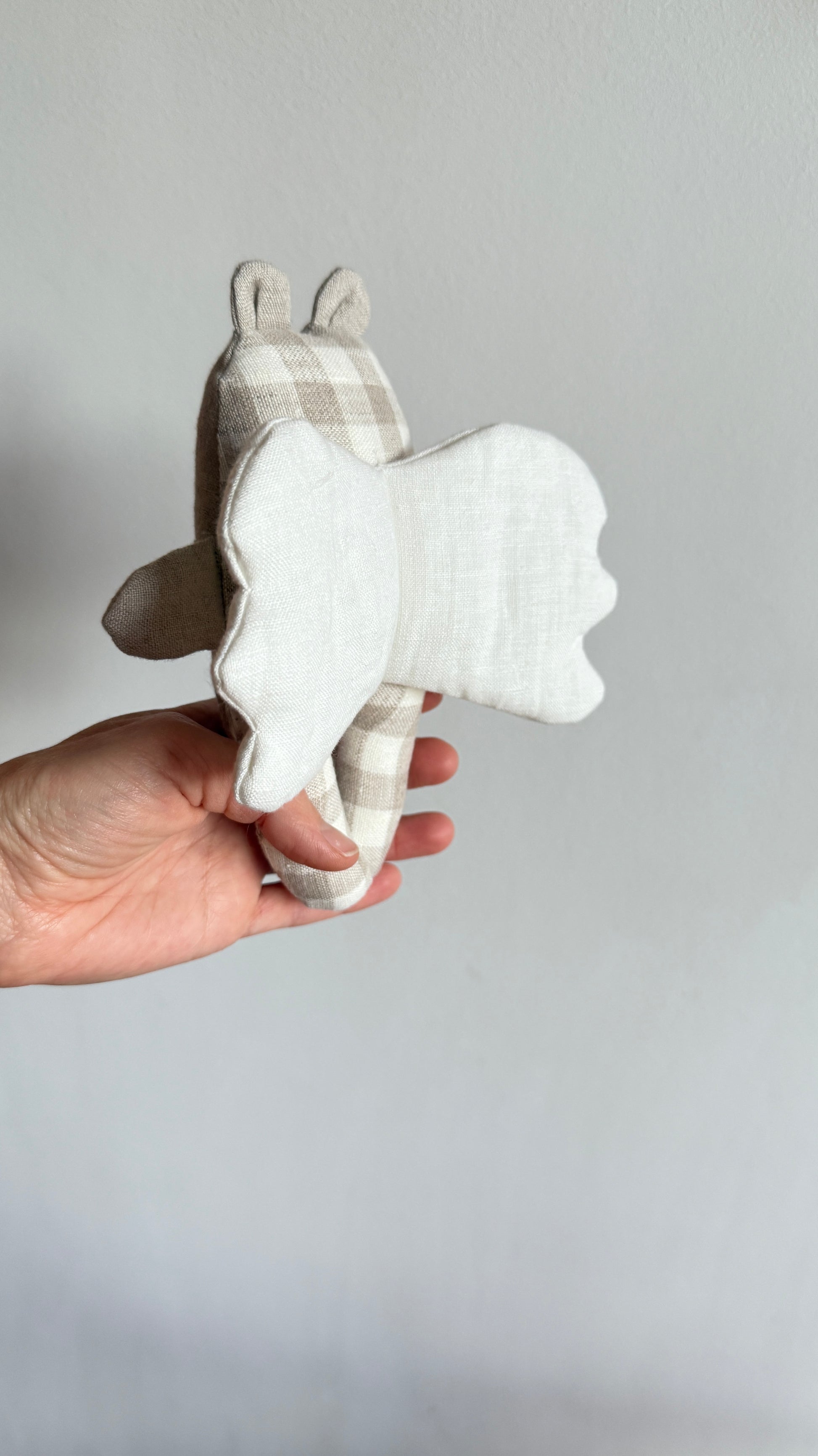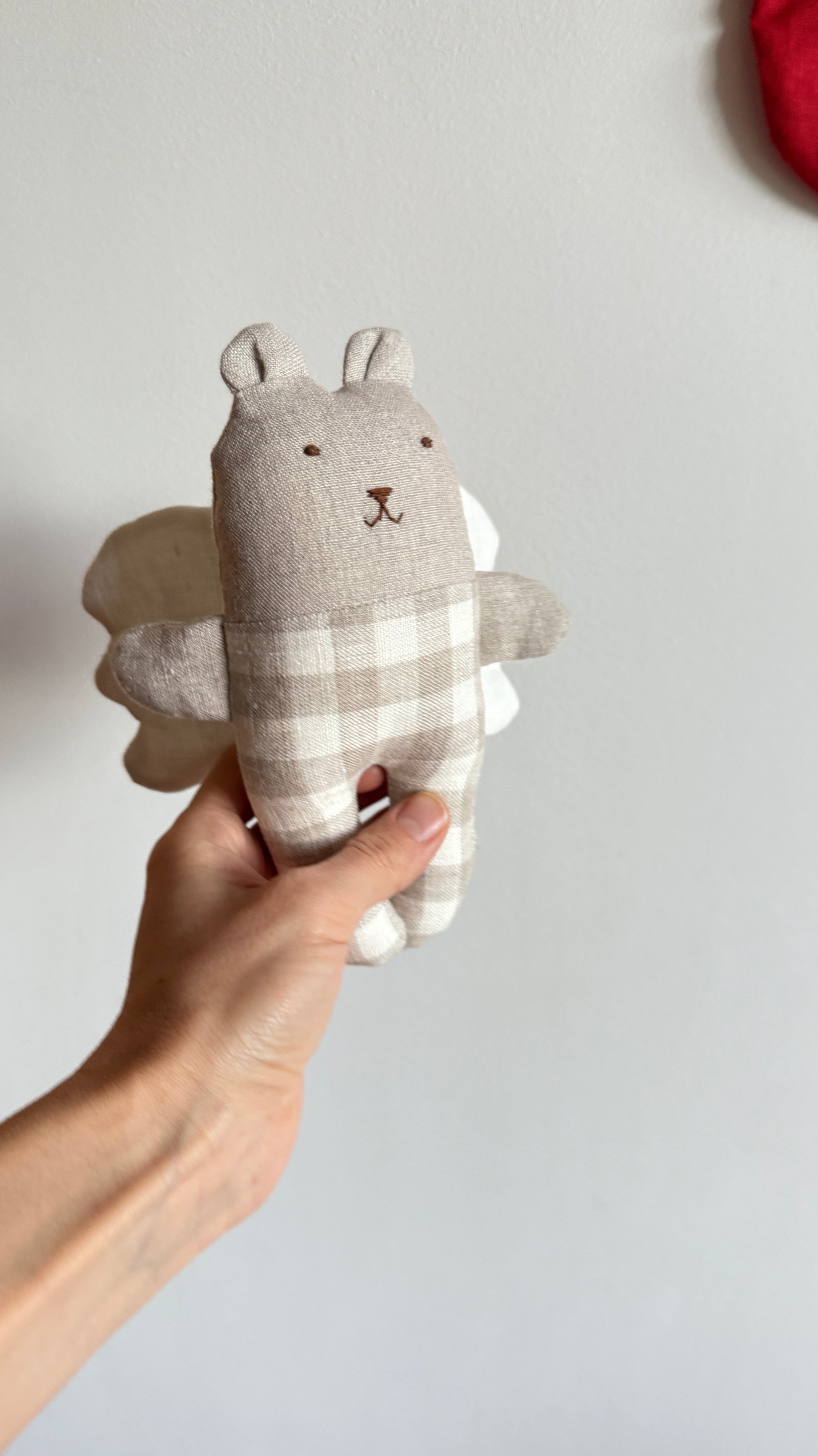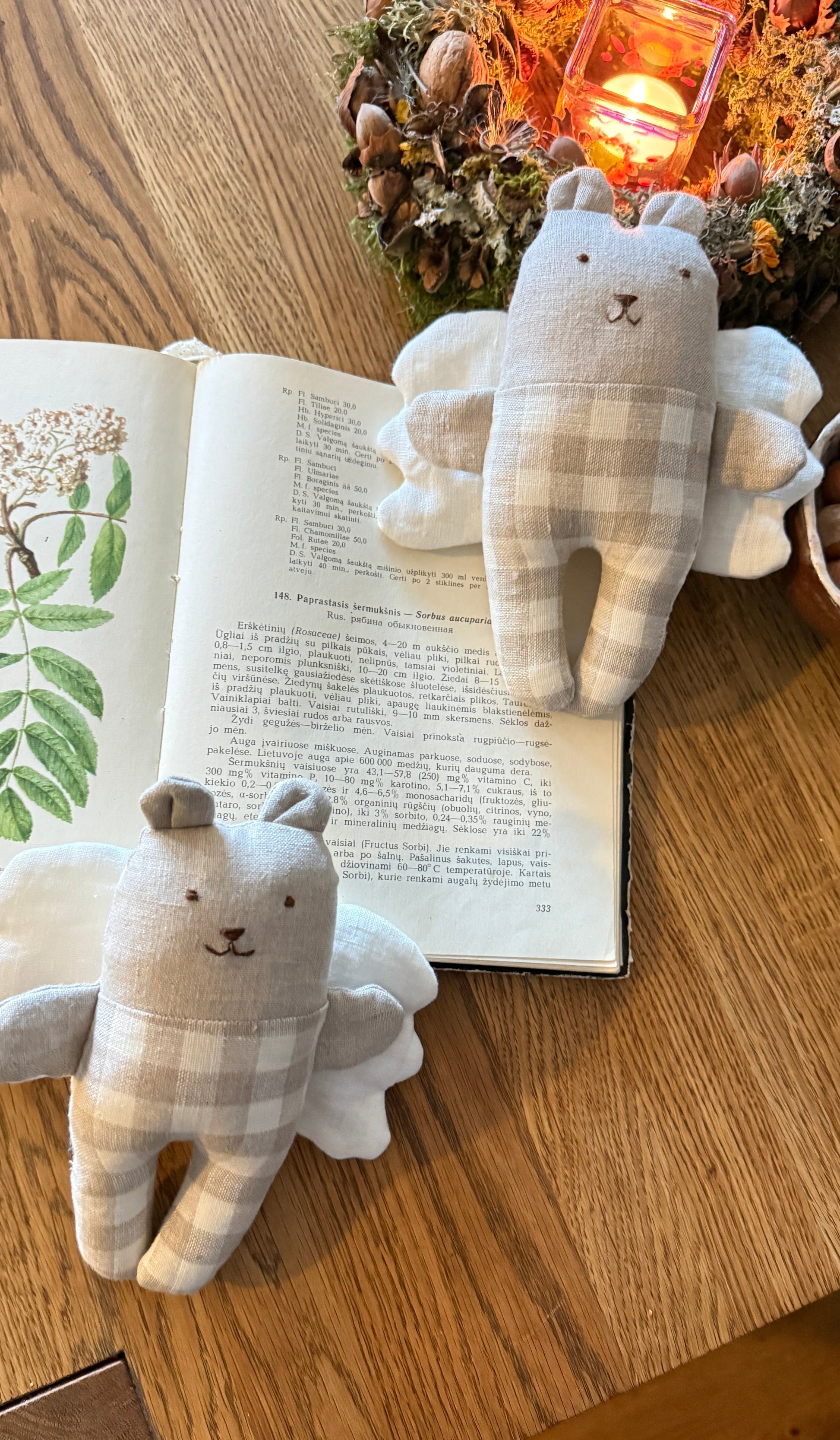 Medžiagos: meškiukas pasiūtas iš lino. Užpildas - antialerginis kamšalas žaislams. Medvilniniai siuvinėjimo siūlai.